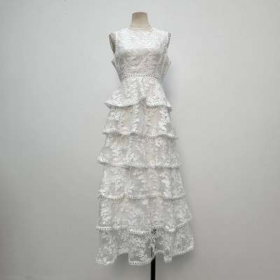 White Lace Sleeveless Ruffled Maxi Dress Elegant Banquet Gown