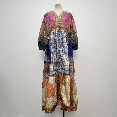 Vintage Patchwork Print V-neck Lantern Sleeve Long Dress Bohemian Vacation Maxi Dress