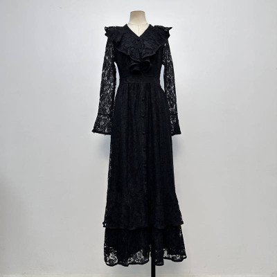 Black Lace V-neck Ruffled Long Sleeve Waist-cinched Maxi Dress