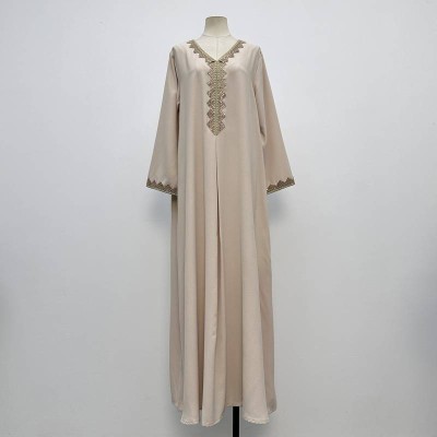 Elegant Embroidered V-neck Long-sleeve Long Dress Solid Color Loose Robe