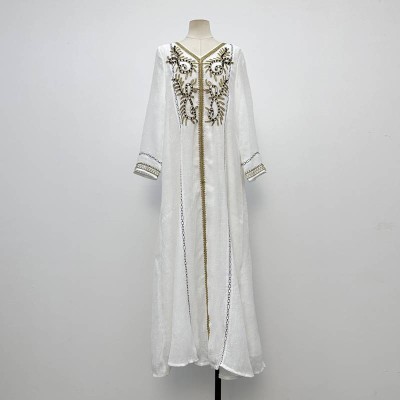 Ethnic Style Embroidered Long Sleeve White Maxi Dress Loose Slim Long Dress