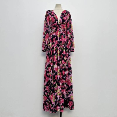 French Style Floral V-neck Twist Waist Long Sleeve Maxi Dress Slim Fit Elegant Long Dress