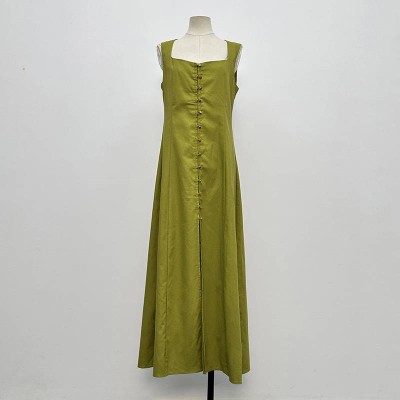 Vintage Square Neck Button Split Sling Long Dress Elegant Sleeveless Dress