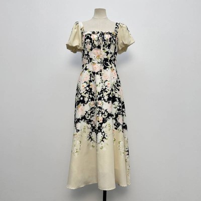 French Square Neck Puff Sleeve Printed Maxi Dress Vintage Temperament Waist Slimming Dress