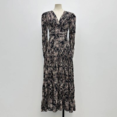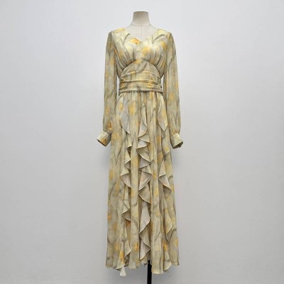 V-neck Waist-cinching Ruffle Long-sleeved Chiffon Dress Elegant Floral Maxi Dress