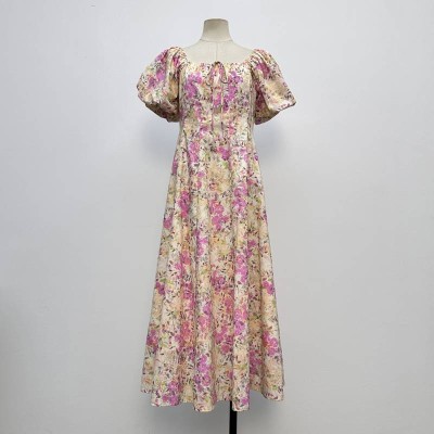 French Square Neck Lace-up Floral Puff Sleeve Long Dress Gentle Style Waist Slimming Dress