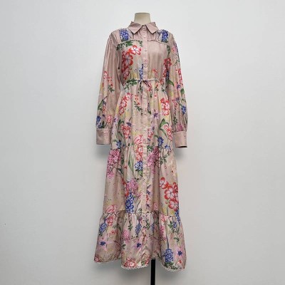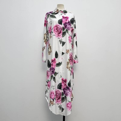 Vintage Rose Print Lapel Long Sleeve Long Shirt Dress