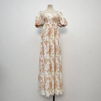 Square Neck Puff Sleeve Floral Chiffon Maxi Dress Slim Fit Elegant Vacation Dress