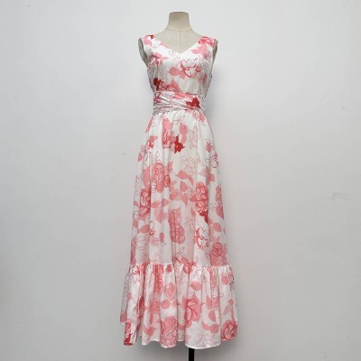 V-neck Sleeveless Printed Waist-tight Maxi Dress