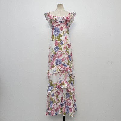 Romantic Floral Print Ruffled Chiffon Strap Maxi Dress Fairy Vacation Style Dress