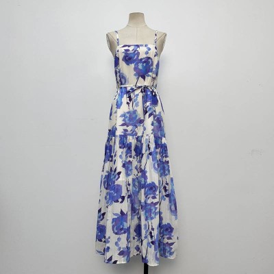 Blue Rose Print Waist-tie Spaghetti Strap Maxi Dress Vacation Style Floral Dress