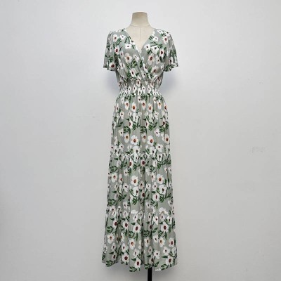 Fresh Floral V-neck Waist-cinched Short-sleeve Chiffon Maxi Dress