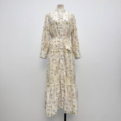 Floral Lace Patchwork Shirt Collar Waist-cinching Long-sleeve Dress for Women Elegant Long Chiffon Dress