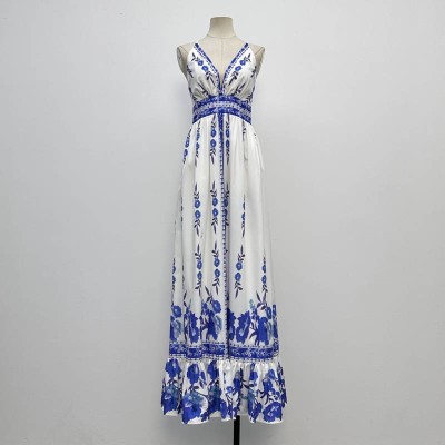 Blue and White Porcelain Style Halter V-neck Long Dress Vacation Style Printed Swing Maxi Dress