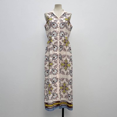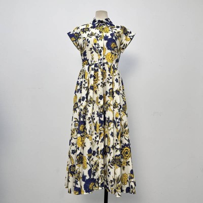 Vintage Print Sleeveless Shirt Collar Long Dress