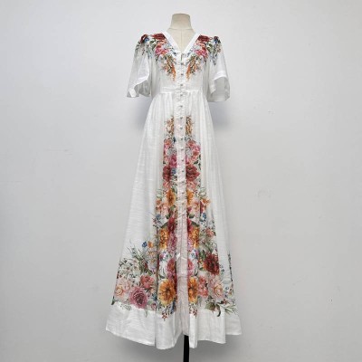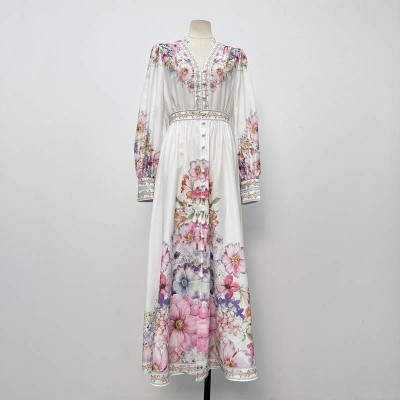 V-neck Long Sleeve Printed Waist-cinching Maxi Dress Elegant Vacation Style White Floral Dress