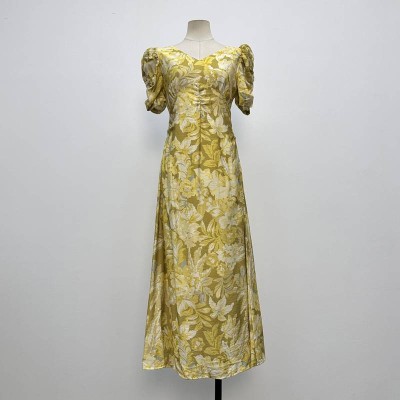 Vintage Yellow Floral V-neck Puff Sleeve Long Dress