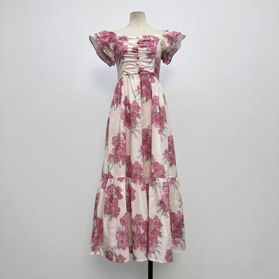 Elegant Blue Floral Print Square Neck Sleeveless Waist Pleated Maxi Dress Vacation Style Dress