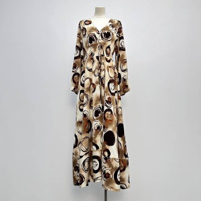 Retro Ink Circle Print V-neck Waist-cinching Long-sleeve Maxi Dress