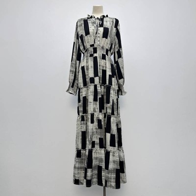 Vintage Abstract Block Print Long Sleeve Waist-cinching Tiered Maxi Dress With Ruffled Neck