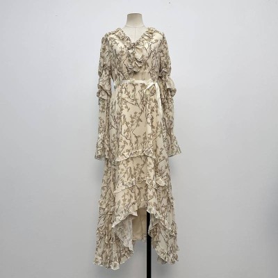 V-neck Ruffled Irregular Hem Chiffon Maxi Dress With Retro Branch Print