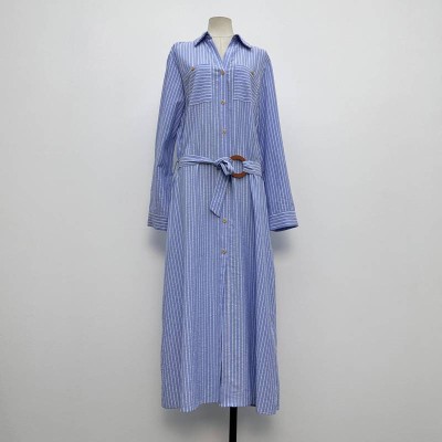 Blue & White Striped Lapel Waist-tie Shirt Dress Long Slim-fit Dress