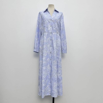 Blue Base White Floral Lapel Waist Cinched Long Sleeve Shirt-style Maxi Dress