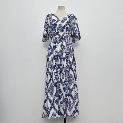 Blue and White Porcelain Pattern V-neck Waist Cinched Long Dress