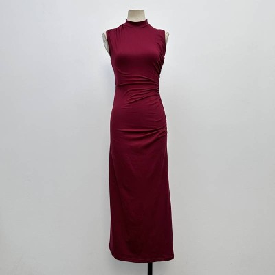 Wine Red Mock Neck Sleeveless Ruched Maxi Dress Slim Fit Bodycon Elegant Dress