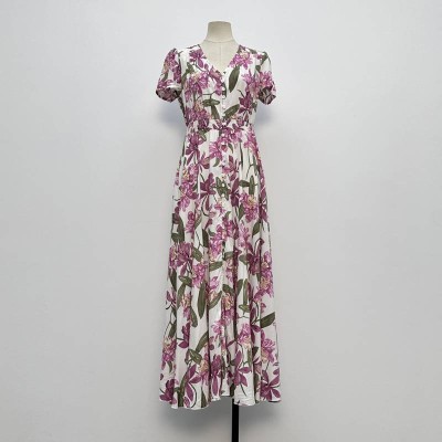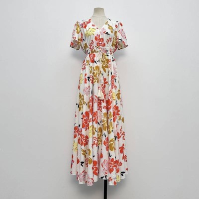 V-neck Short Sleeve Waist-tie Printed Maxi Dress Elegant Chiffon Dress