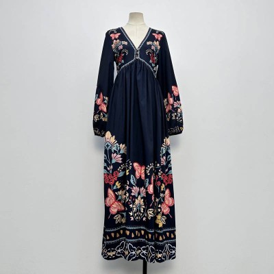 Ethnic Print V-neck Long Sleeve Waist-cinching Maxi Dress Vintage Loose Long Dress