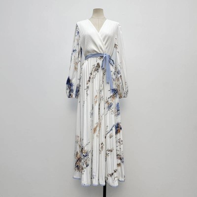 V-neck Waist-tie Ink Print Pleated Long-sleeve Dress Elegant Slim Chiffon Long Dress
