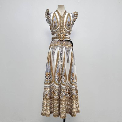 Vintage Print V-neck Ruffle Sleeve Waist-cinching Maxi Dress Elegant Vacation Style Dress