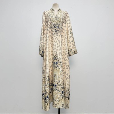 Vintage Leopard Print Embroidered Maxi Dress Elegant Stand Collar Loose Long Dress