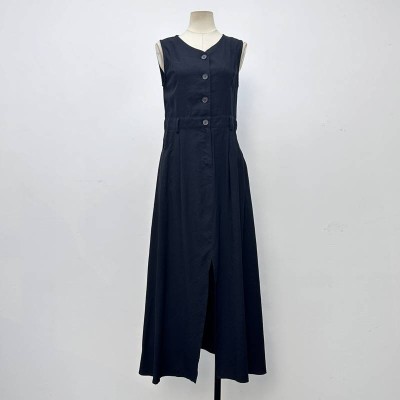 Simple Sleeveless V-neck Button-front Long Dress Black Commuter Temperament Maxi Dress