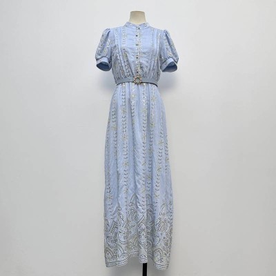 Light Blue Embroidered Stand Collar Puff Sleeve Waist Slim Long Dress