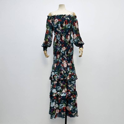 Vintage Floral Off-the-shoulder Long Sleeve Waist Cinched Chiffon Ruffle Tiered Maxi Dress