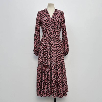 Black-based pink floral V-neck long-sleeve waist midi dress