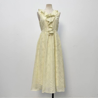 Light Yellow Ruffled Collar Jacquard Sleeveless Midi Dress