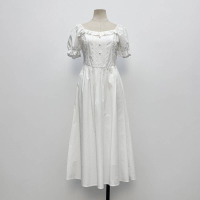 French Square Neck Puff Sleeve White Midi Dress Waist Slimming A-line Dress
