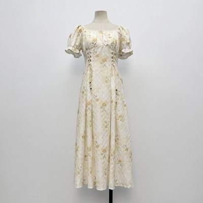 French Square Neck Floral Puff Sleeve Waist-cinched Midi Dress Retro Gentle Style Lace-up Dress
