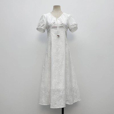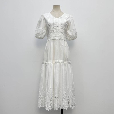 French Style V-neck Lace-up Puff Sleeves Embroidery White Midi Dress