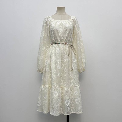 Gentle Style Embroidered Square Neck Waist-cinched Midi Dress Elegant Temperament Slimming Skirt