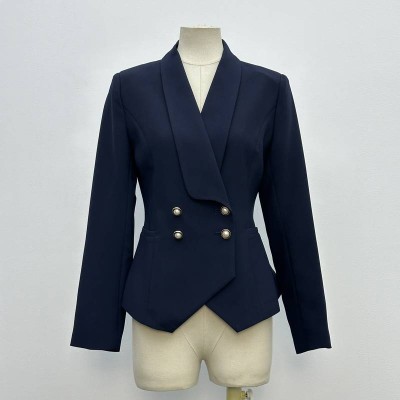 Navy Waist-cinching Double-breasted Blazer, Elegant Commuting Professional Outfit