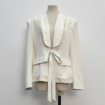 Lace Patchwork Tie Waist White Blazer