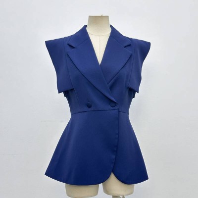 Elegant Royal Blue Waist-cinching Sleeveless Blazer Collar Top Commute Style Slimming Fitted Vest-style Top