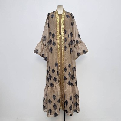 Gold Leaf Pattern Flared Sleeve Long Two-Piece Set Mesh Outerwear + Inner Dress Robe