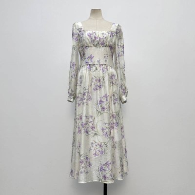 Elegant Square Neck Purple Floral Print Waist-cinched Long Sleeve Midi Chiffon Dress