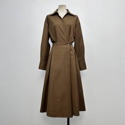 Elegant Lapel Waist-cinched Mid-length Shirt Dress Vintage Brown Solid Color Commuter Dress