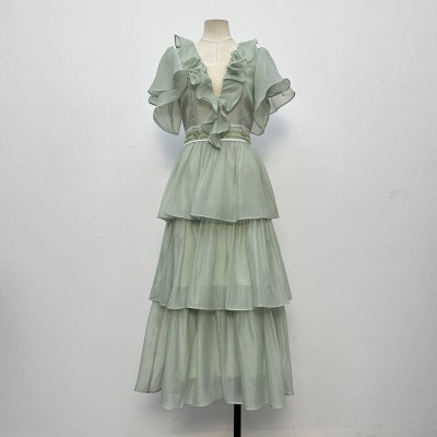 French V-neck Ruffled Chiffon Tiered Midi Dress Elegant Waist Slimming Fairy Dress